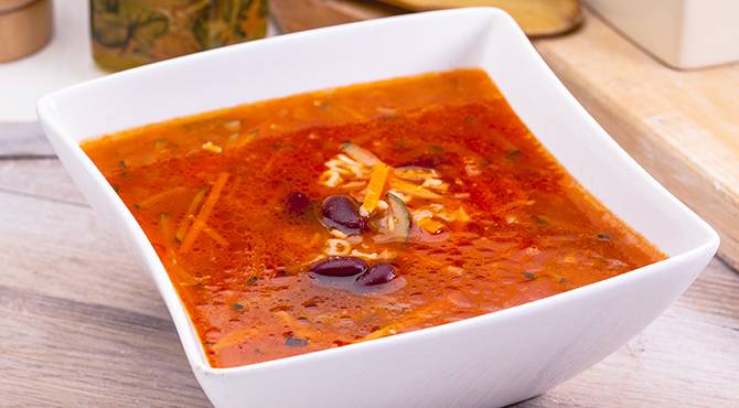 تضاف المكونات المتبقية مع التحريك ما عدا المعكرونة، تسخن حتى تغلي ثم تخفف الحرارة. تطهى مدة 20 لـ 30 دقيقة مع وضع الغطاء، أو حتى تطرى الخضراوات.
