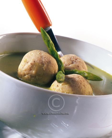 - تطهى كويرات الدجاج المفروم بالبخار لمدة 15 دقيقة. يسخن الحساء ويقدم مرفوقا بكويرات الدجاج المفروم.
