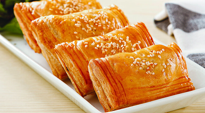 توضع المثلثات في الصينية المجهزة وتدهن بالقليل من البيض وترش بالسمسم.