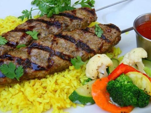 5. يسكب الأرز في طبق التقديم، وتنثر حبّات الرمّان على وجهه، وتوزّع قطع الكباب المقلي أو المشوي.