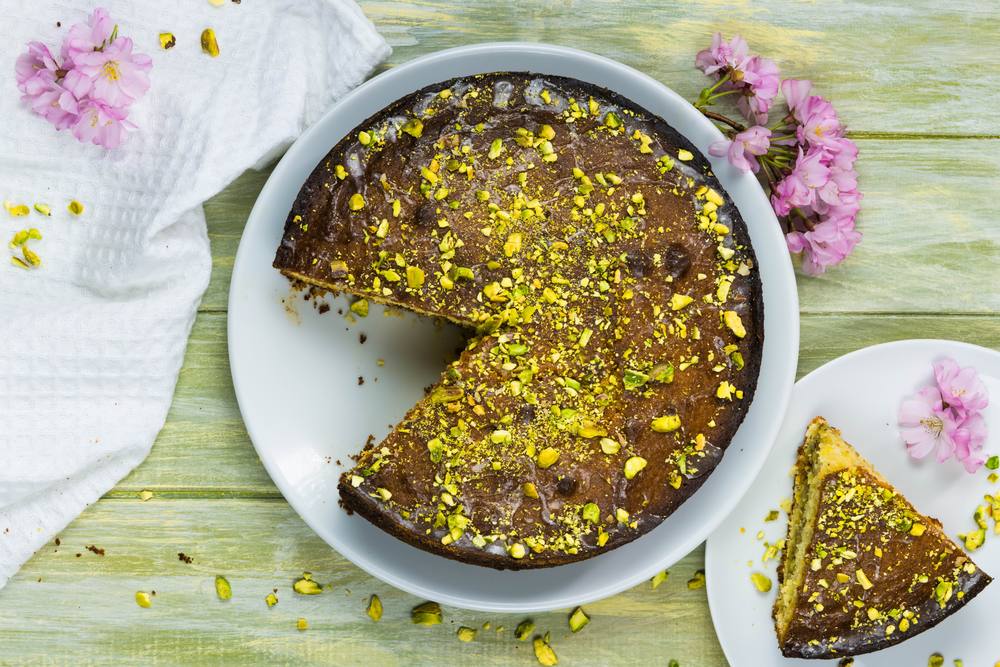 6. توضع الحلاوة في قالب وتُزين بالعسل والفستق على الوجه، وتُقدم بدرجة حرارة الغرفة.