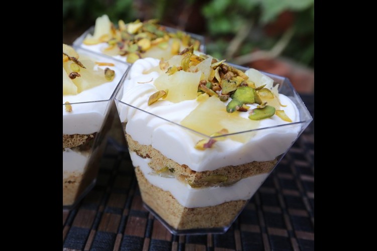 3. حضري أكواب التقديم، ضعي مقدار ملعقة من البسكويت المكسر بقاع الكاسات، رشي البسكويت بملعقة كبيرة من عصير الأناناس، ثم ضعي طبقة من الكريمة المجهزة، وطبقة من شرائح الأناناس، وضعي القليل من الفستق الحلبي المفروم.