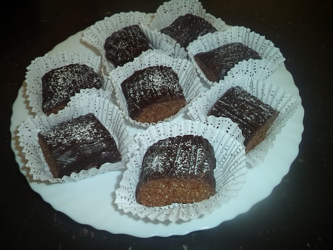 4. نضع الصينية في الثلاجة ونزين بالشوكولاتة والسكر البودرة أو بحسب الرغبة وذلك بعد التقطيع.