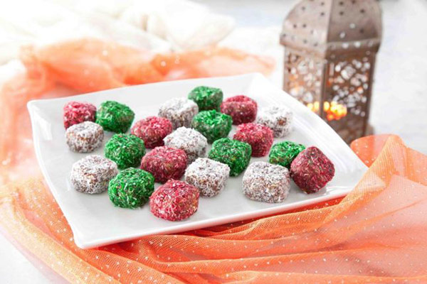 2. شكّلي هذا الخليط على شكل مربعات صغيرة، غمسيها في جوز الهند وقلّبي لتتغطّى تماماً.