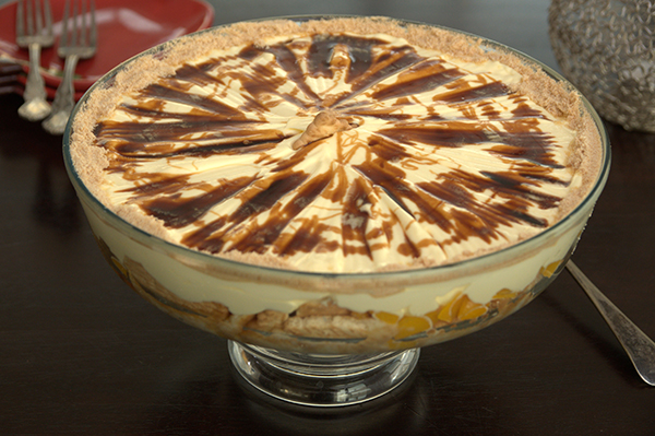 5. وزعي صلصة “الكراميل” على الحلى، وانثري البسكويت الناعم للتزيين، قبل التقديم.