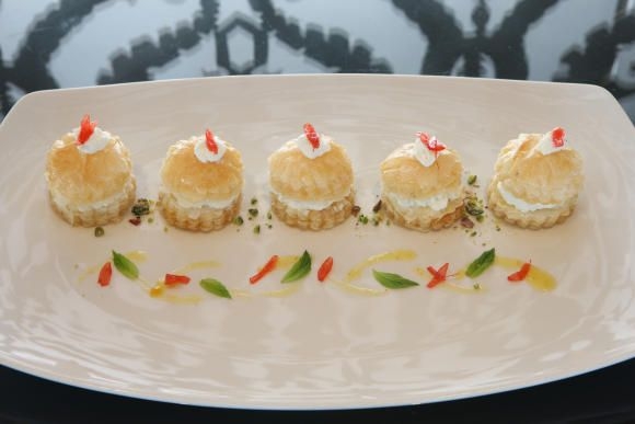 3. يتمّ إدخال هذه الصينية إلى الفرن لمدّة 40 دقيقة، وذلك حتى تتخذ قطع العجين اللون الذهبي. ثم، يضاف القطر. وبعد أن تبرد، تقسم كل قطعة إلى قسمين، وتفرد القشدة على كل قسم. ثم، تزيّن بالفستق الحلبي الناعم.