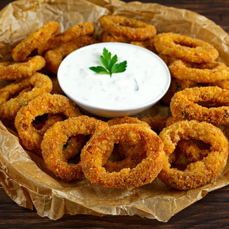 8. صفي دوائر البصل في الصينية المجهزة و أدخليها الفرن لمدة 10 دقائق حتى تصبح ذهبية ومقرمشة وقدميها ساخنة إلى جانب الصوص المفضل لديك.