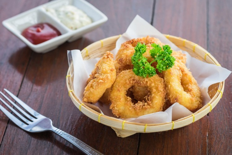 6. اقلي حلقات البصل بالزيت المحمى لمدة 3 دقائق حتى يتحمر ويتقرمش من جميع الجهات.