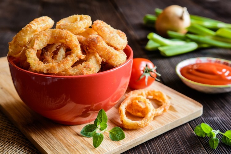 حلقات بصل مقرمشة بدون بيض … من أطيب المقبلات الساخنة الجانبية المقدمة بجانب ساندويشات البرغر، جربي تحضيرها في المنزل بكل سهولة وبدون بيض