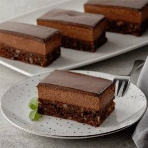 5. بعد إخراج الصينية من الثلاّجة، تُسكب كريما الشوكولاتة وتُنشر على سطحها، ثم يُقطّع القالب إلى قطعٍ تُقدّم باردة.