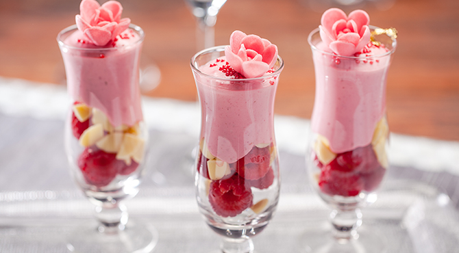 توضع في كؤوس صغيرة بكيس الحلواني وتزين بتوت العليق الطازج وزهرة الويفر والحلوى الزهور.