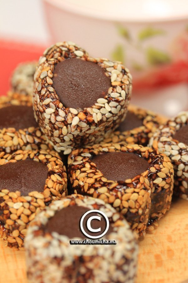 - تشكل كويرات من عجين الفول السوداني، تمرر في السمسم، توضع في القالب وتبسط قليلا.