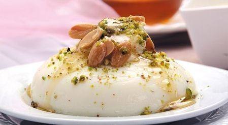 - يمكنكِ قلب محتوى طبق القشطلية فوق طبق تقديم مسطح بحيث تبدو مثل القبة واسكبي من ثم قطر السكر فوقها ، وزينيها بالمكسرات