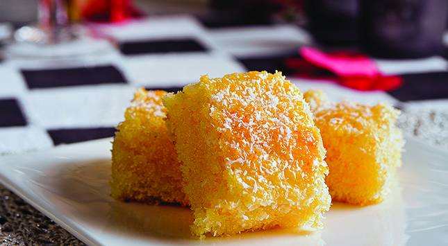 يرفع الخليط من الفرن ويصب عليه القطر البارد، ثم يوضع جانبًا كي يبرد إلى درجة حرارة الغرفة، ثم يزين بجوز الهند الإضافي، وبعدها يقطع إلى مربعات ويقدم.