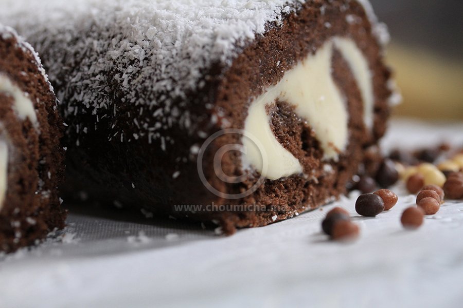 - يسقى البسكويت بشراب الفانيلا. يغطي بطبقة من كريمة الكاناش بالشكلاطة البيضاء (مع تجنب وصول كريمة الكاناش إلى الجوانب). يلف البسكويت في ورق المطبخ ويدخل إلى الثلاجة. قبل التقديم تدهن الحلوى بالملمع (ناباج) وترش بجوز الهند.
