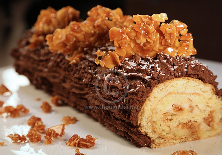 - توضع كريمة الشانتيي بالشكلاطة في جيب الحلواني برأس مسنن وتغطى بها كل واجهة البسكويت ليأخذ شكل جذع خشبي. تقدم الحلوى مزينة بجوز الهند وقطع البرالان.