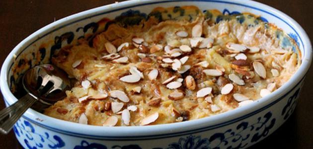 • نبدأ بوضع شرائح الباف الباستري على شكل طبقات؛ أول طبقة باستري مُفتّتة، ثمّ يتبعها طبقة من خليط المُكسّرات بعد تصفيته من ماء الزهر، ثمّ طبقة ثالثة وهي طبقة من فتات الباف الباستري.