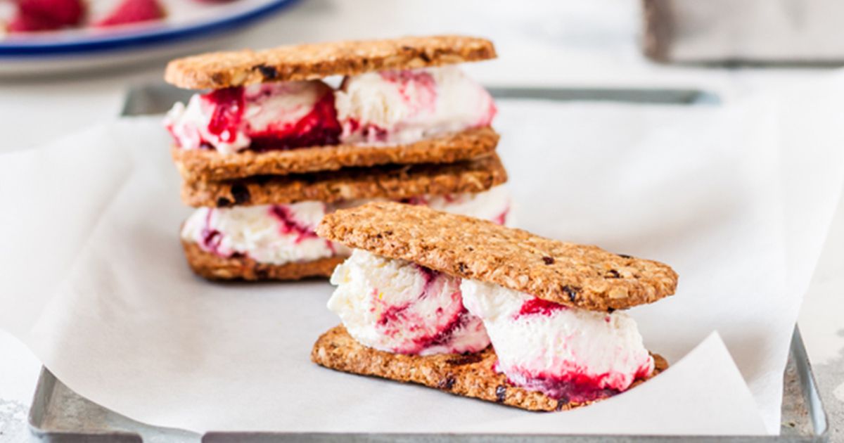 1- في وعاء الخفاق الكهربائي، أخفقي الأيس كريم والقشطة حتى تحصلي على خليط متجانس. 2- ضعي خليط الأيس كريم في وعاء. أضيفي حبات التوت وقلّبي المكونات حتى تتداخل. 3- شكّلي طبقة من البسكويت في صينية فرن. بواسطة ملعقة الايس كريم، شكّلي كرات من مزيج الأيس كريم وضعيها على وجه البسكويت. 4- أضيفي طبقة من البسكويت على الوجه حتى تحصلي على شكل سندوتشات صغيرة. 5- أدخلي الصينية إلى الفريزر وقدّمي الحلى بارداً. ألف صحة!