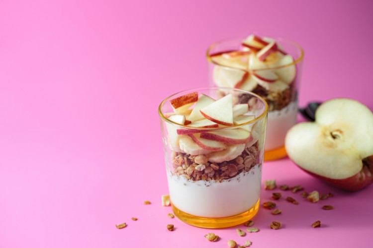 - في أكواب التقديم، رصي كمية من خليط التمر ثم أضيفي طبقة من خليط التفاح بالكراميل ثم طبقة لبن وتفاح والكراميل وعلى الوجه زيني بالتفاح.