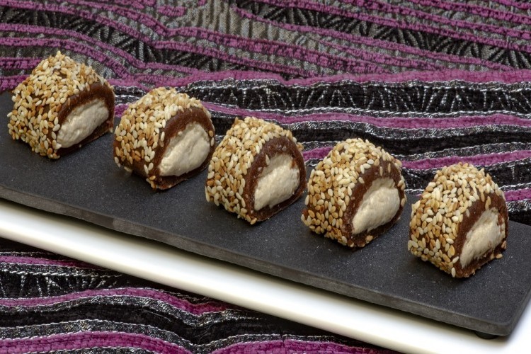 3- تلفّ جميع المكونات بنفس الطريقة التي تحضر بها قطع السوشي: عجينة التمر في الأسفل والحلاوة فوقها.