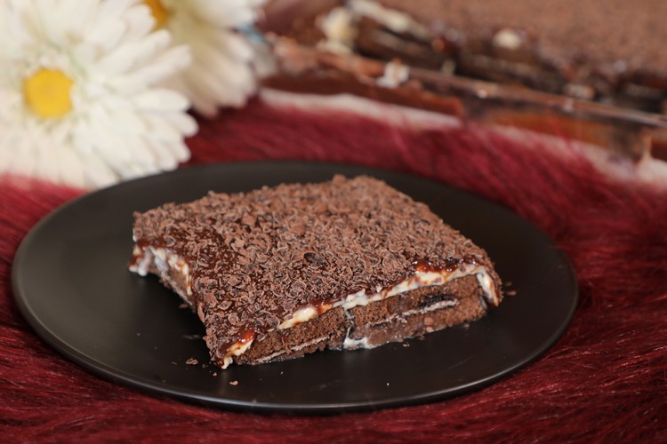 5. أدخلي الطبق للثلاجة حتى يتماسك الحلى، وزيني بالشوكولاتة المبشورة أو بحسب الرغبة.