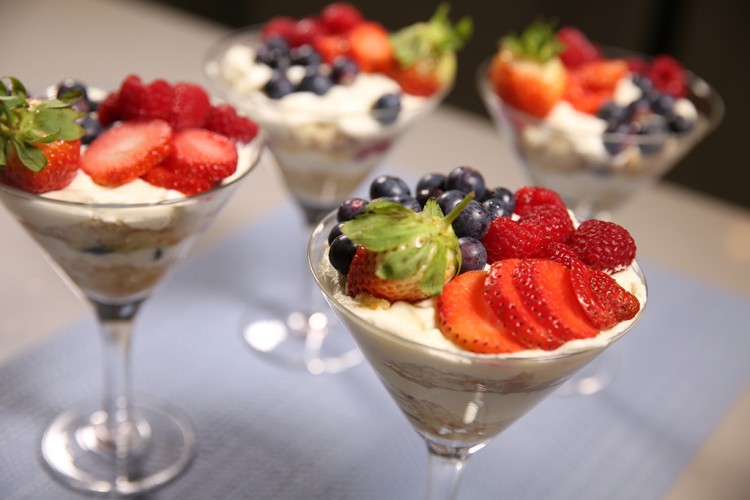 2. ضعي طبقة من الكريمة والفراولة والبلوبري في قاع أكواب لتقديم.