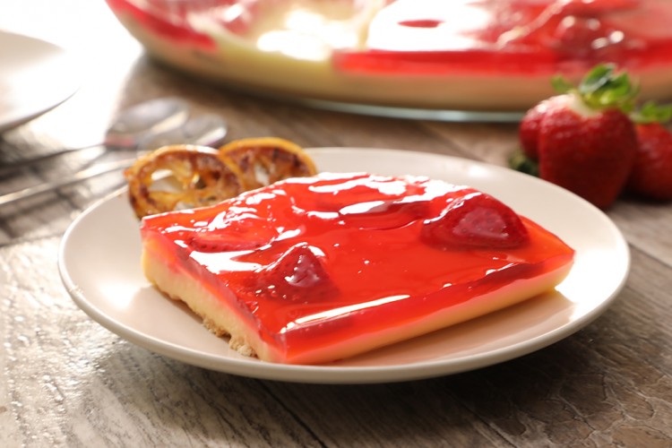 - لتحضير طبقة الجلو: اخلطي الماء الساخن مع بودرة الجلو، ووزعي المزيج فوق طبقة الكاسترد.
