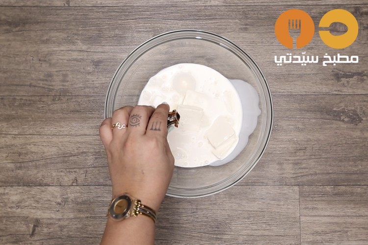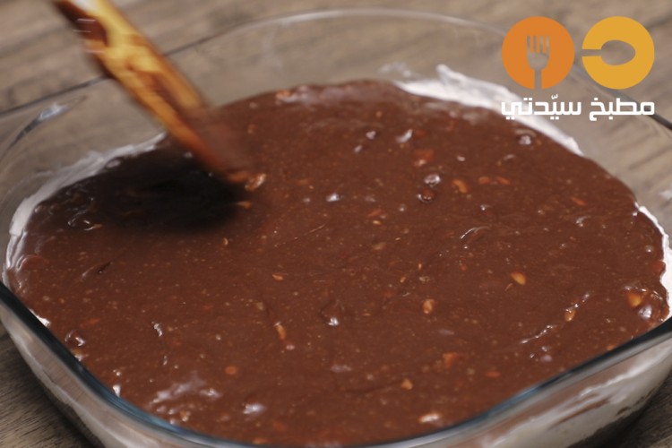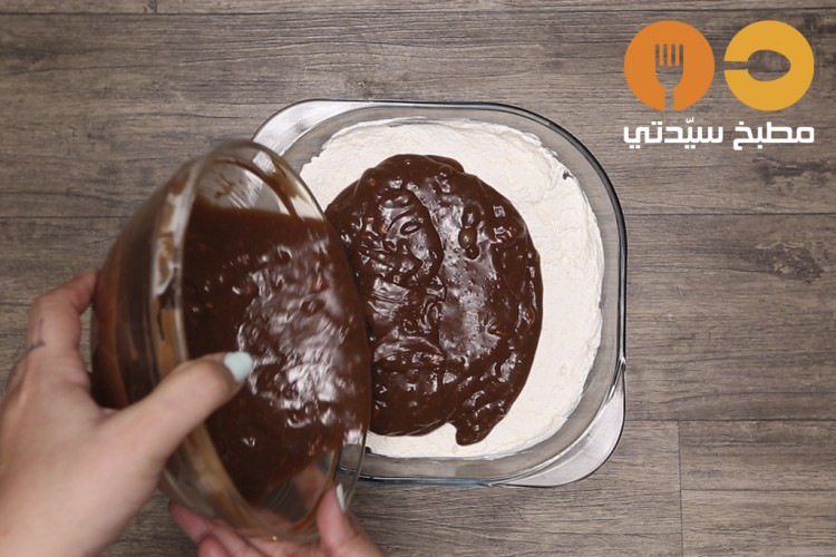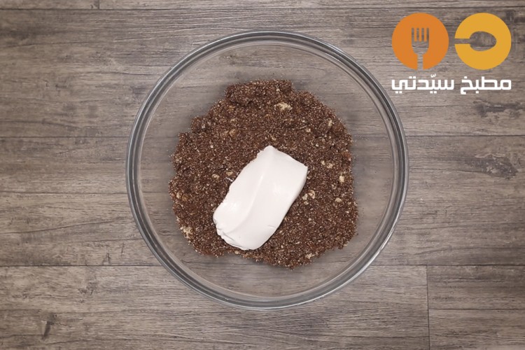 لتحضير القاعدة: فتتي كيك الشوكولاتة والماربل بوعاء الخلط جيداً، ثم أضيفي القشطة