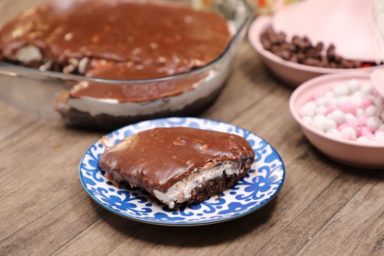- لتحضير الطبقة النهائية: قطعي حبات المارس بوعاء، وأضيفي القشطة وحركي حتى تتوزع المكونات وتتجانس، ثم أضيفي حبيبات الشوكولاتة وحركي مرة أخرى، ووزعي المزيج على الوجه.