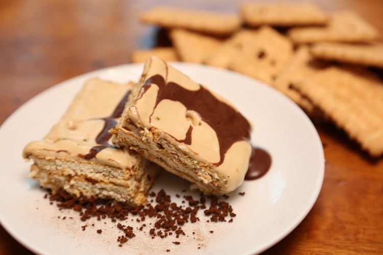 2. حضري طبق التقديم، واخلطي القهوة سريعة التحضير مع كوبان الماء، وبللي قطع البسكويت بالقهوة، وضعيها بقاع الطبق.