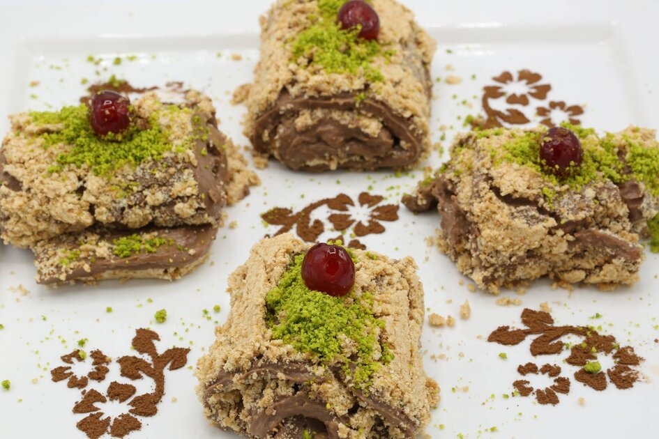 زيني حلى رولات المهلبية ببودرة الكاكاو والفستق المجروش وقدميها مباشرة.