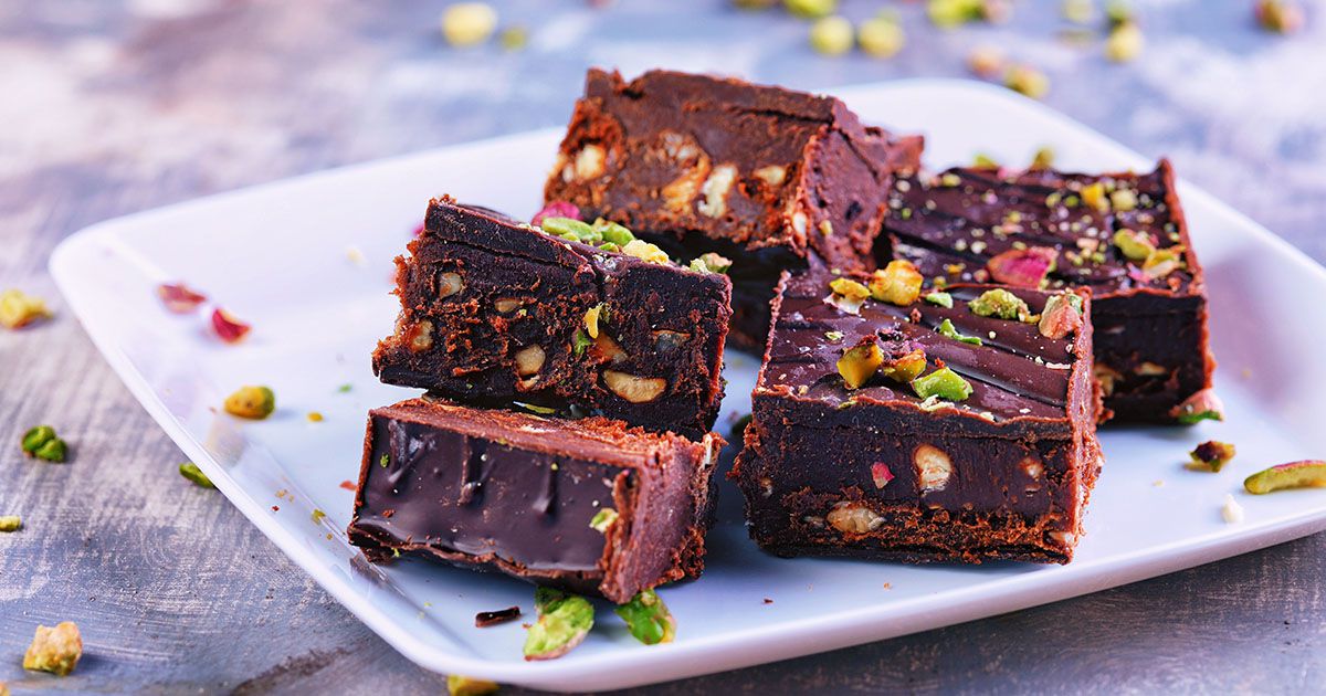 4- في اليوم التالي قطّعي الحلى إلى مكعبات، زيّنيه بالفستق الحلبي وقدّميه إلى جانب القهوة. ألف صحة!