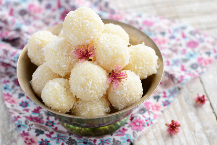 - شكّلي العجينة كريات صغيرة وغمّسيها في ما تبقى من جوز الهند.