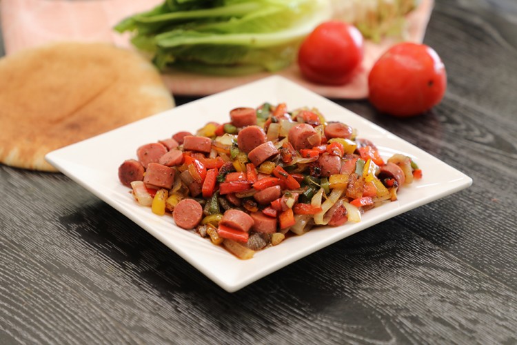 - أضيفي النقانق والملح بحسب الرغبة، واتركي المكونات مع التقليب حتى يتحمر النقانق وتذبل الخضار.