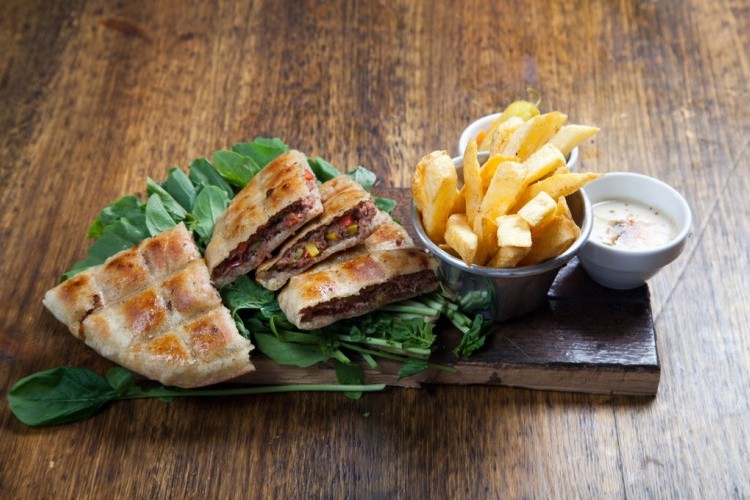 3. افتحي الخبز فتحة جانبية وورصي كمية وافرة من اللحم فيه.