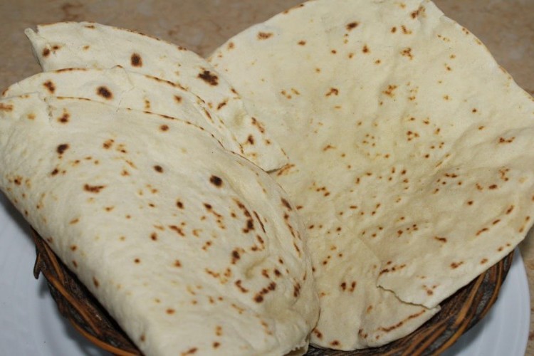 3. خذي كل كرة على حده وترقيقها على سطح يحتوي على رشة دقيق وجعلها في أقل سمك ممكن ونتركها حتى ترتاح قليلا ونقوم بفرد أخرى حتى أن تنتهي من فرد الـ6 كرات ثم قومي بتسخين الصاج أو المقلاة أو الطاسة على حرارة عالية ثم تقوم بدهن وجه الرغيف بالزيت بالفرشاة ونضع المنطقة المدهونة على المقلاة الساخنة ثم نقوم بتقليب الرغيف على الوجه الآخر حتى يتخذ اللون الذهبي وتقتصر مدة التحضير على حوالي عشرون ثانية ثم قومي بتغطية الخبز بأحد قطع القماش القطنية ووضعه في الفريز حتى الاستخدام .