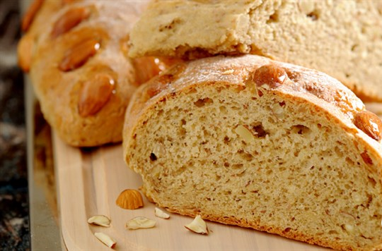 4. يضاف اللوز المهروش ونعجن دقيقتين لمزجه ثم توضع العجينة في وعاء مدهون بقليل من الزيت، تغطى وتترك تختمر إلى أن يتضاعف حجمها .