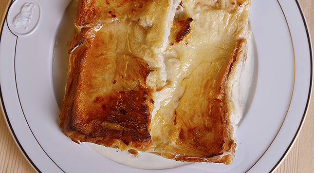 يصب خليط الحليب على الخبز بحيث يغطيه.