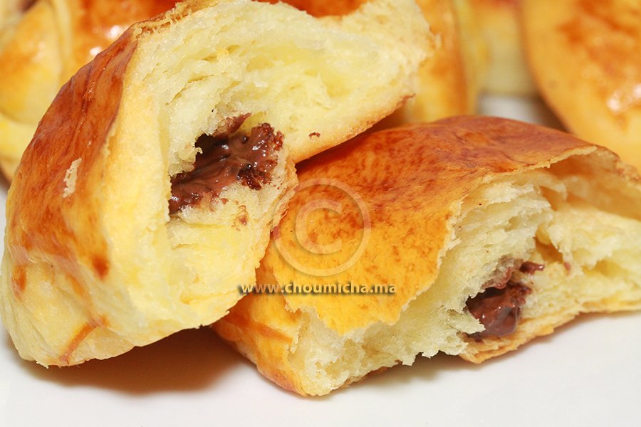 • يوضع عود شكلاطة في طرف شريط العجين ثم يلف حول نفسه للحصول على خبيزات بالشكلاطة.