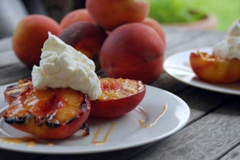 1. ينثر فوق أنصاف الخوخ السكر البودرة.