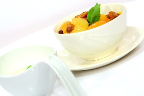 4. ضعى الخوخ بالتمر فى الثلاجة لمدة ساعتين وقدميه بارد مع الزبادى وزينيه بأوراق النعناع الأخضر