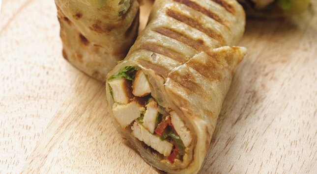 توضع كمية من الدجاج وخليط من المكونات المتبقية على كل رغيف من خبز البراتا ويُلف الخبز. يمكن شواء الساندويتش في محضرة الساندويتشات، ثم يُقدم ساخنًا.