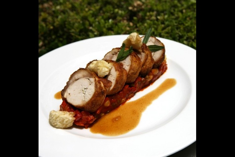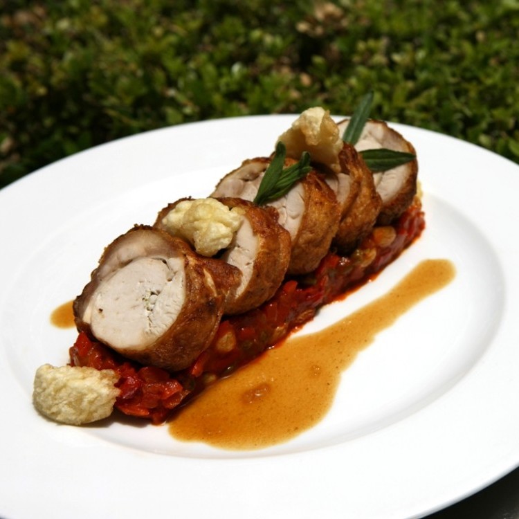 5 في طبق التقديم، يسكب مربّى الفليفلة الحمراء مع الزبيب الأشقر، وتوضع فوقه صدور الدجاج المطهوّة، ويضاف الثوم المخلوط مع الطحين إليه.يزّين هذا الطبق بأوراق الصعتر الأخضر، ويقدّم مع مرق الدجاج.