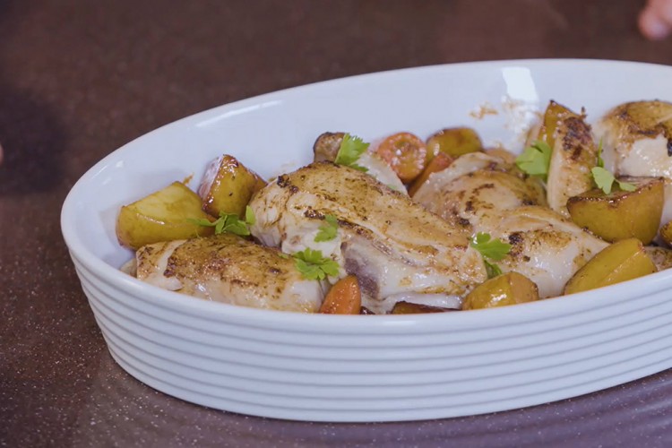 - ضعي الدجاج في طبق التقديم، وأضيفي الخضار على جوانب الطبق.