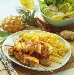 - يوضع الدجاج في أسياخ خاصة بالشوي و يوضع معه بالتبادل الفلفل الرومي و البصل و الأناناس