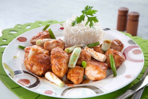 - في طبق تقديم عميق أسكبي الدجاج والصلصة. أنثري الفلفل الأحمر وقدمي مع الأرز الأبيض.