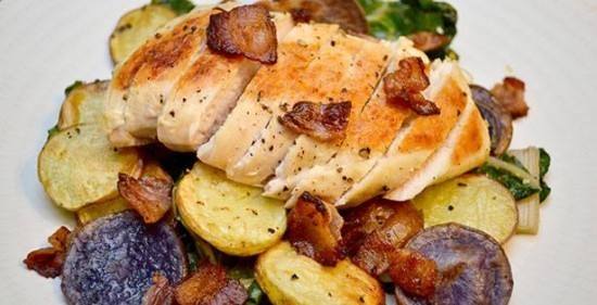 - توضع البطاطس و الدجاج فى صينية فرن و تتبل بالملح و الفلفل جيداً.
