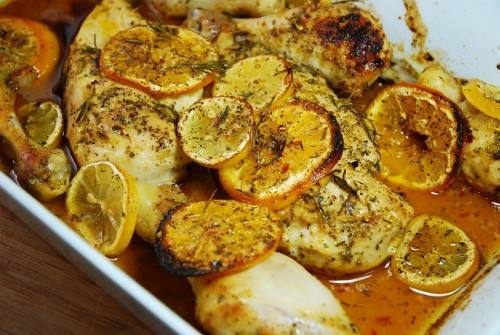 - تخلط كل المكونات ما عدا شرائح البصل و الليمون و قرون الفلفل والماء ثم تدعك أنصاف الدجاج جيداً بالخليط.