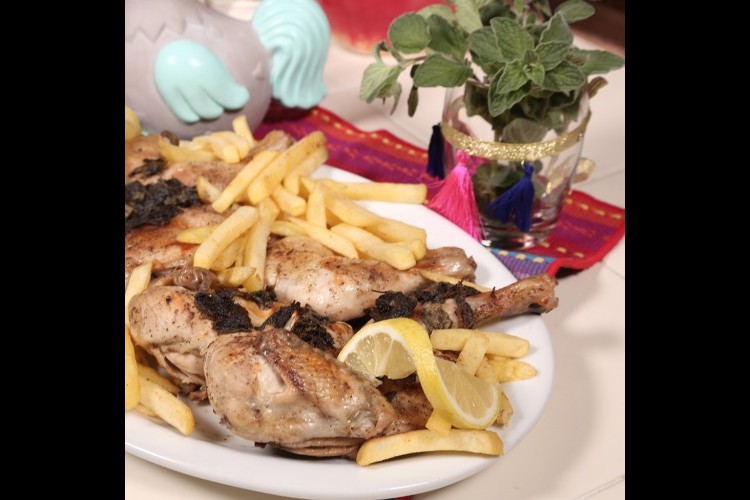 5. للتحضير: ضعي الدجاج بصينية الفرن، وصبي كوب من الماء، وأدخلي صينية الدجاج للفرن المحمى مسبقاً لمدة ساعة على درجة حرارة 200، وقدمي الدجاج بجانب البطاطس المقلية.