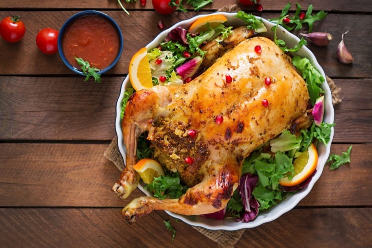 - ضعي حشوة الكينوا داخل الدجاجة الكاملة وقومي بغلقها بالليمون أو أعواد خشبية بإحكام ثم ادهني الدجاجة بتتبيلة معجون الطماطم.